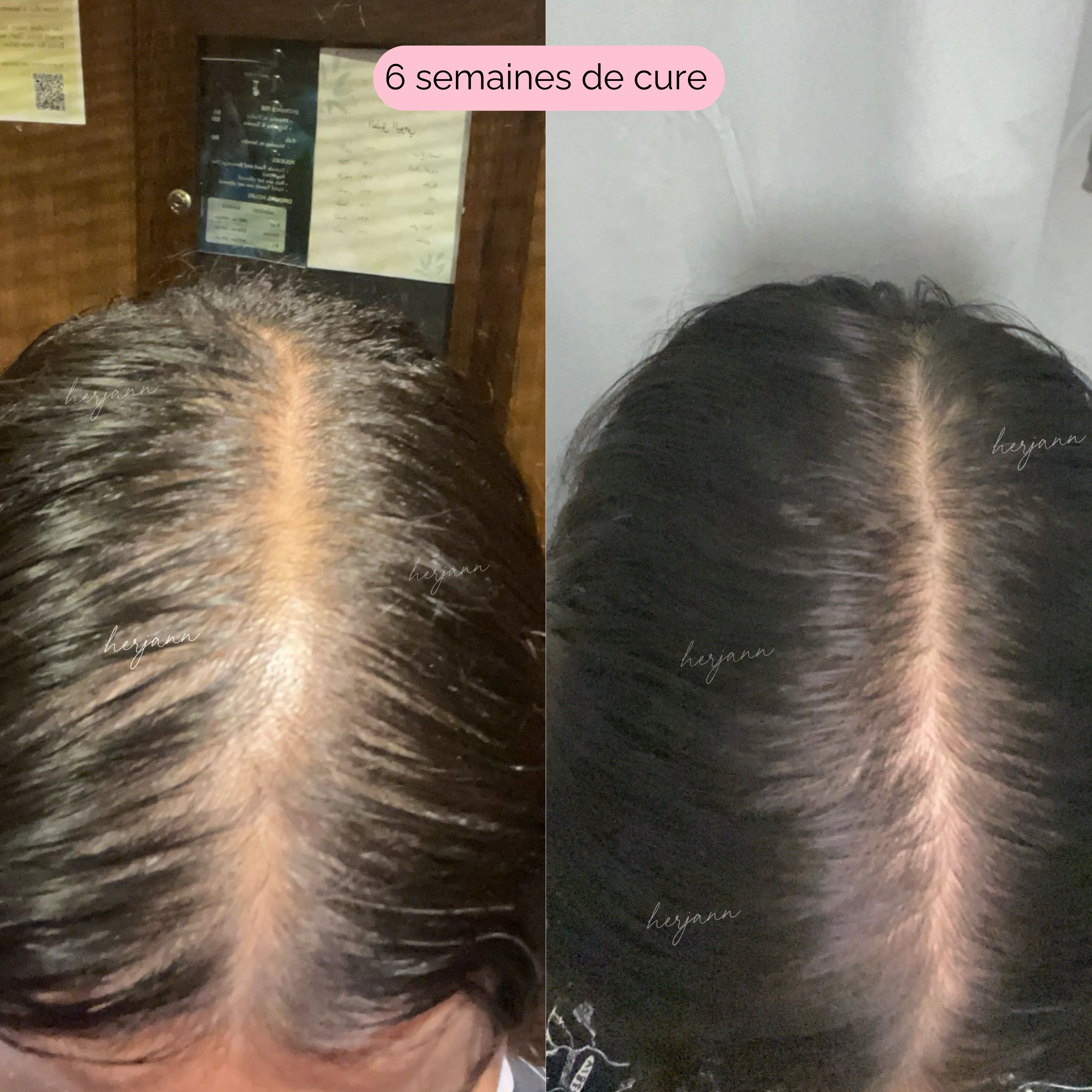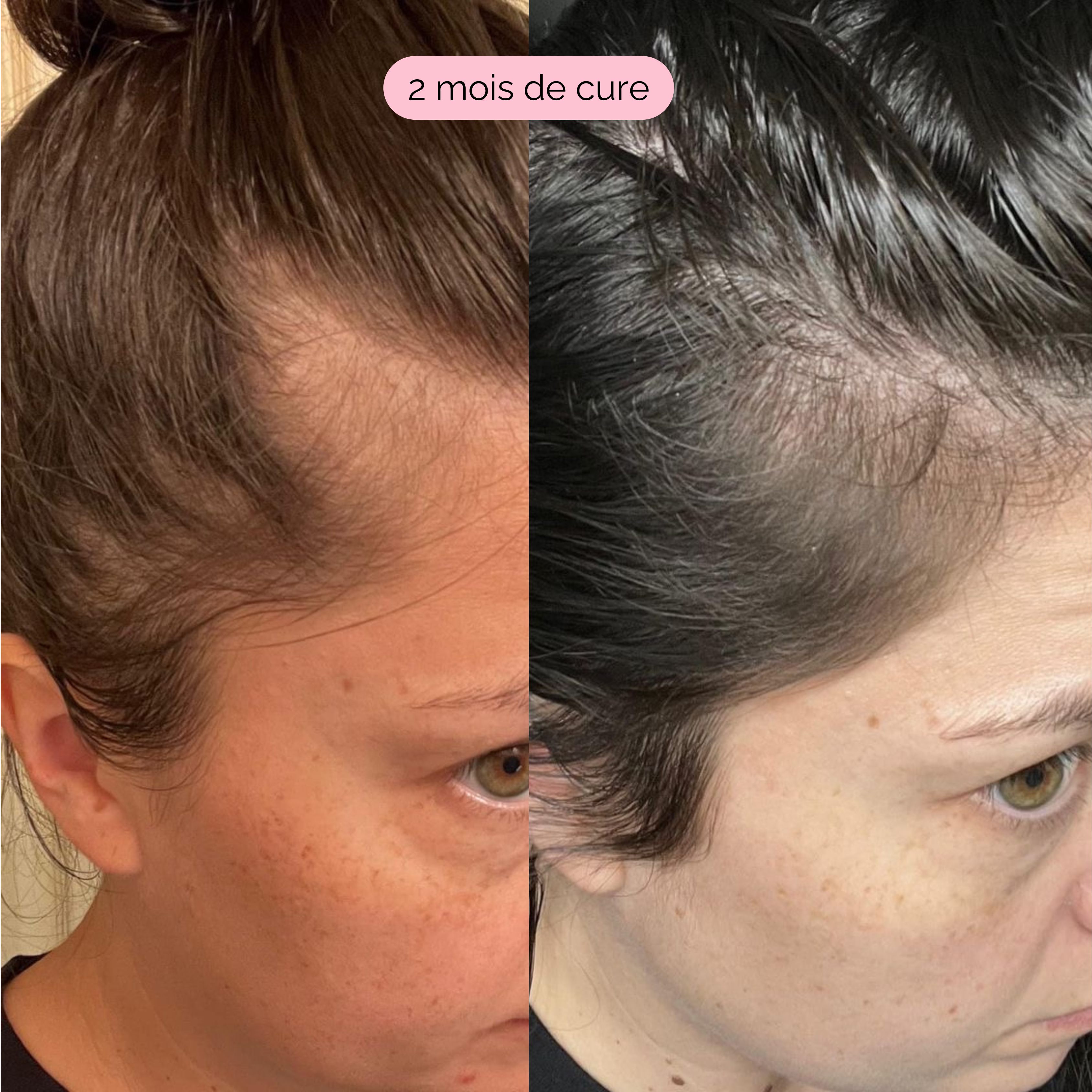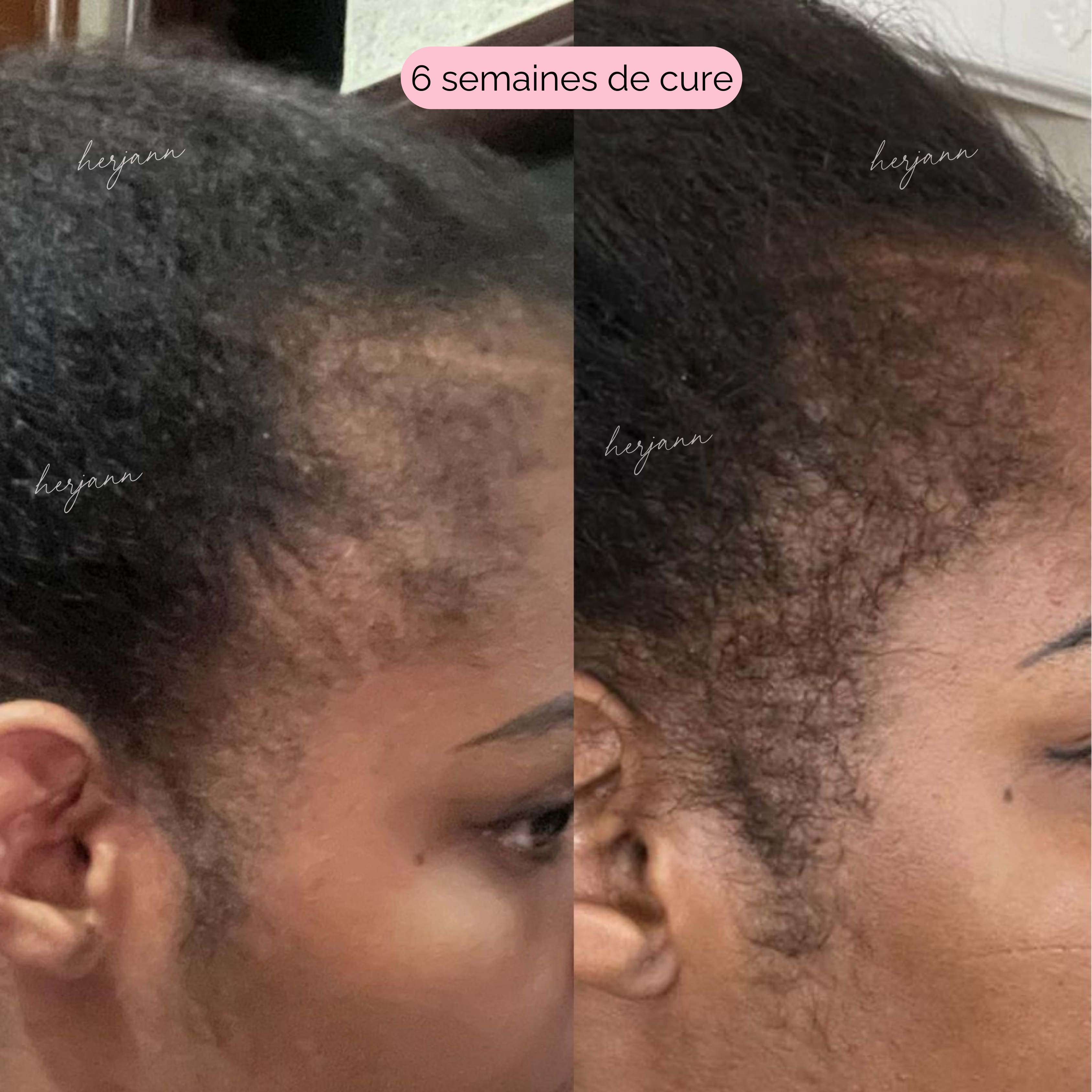 “J’ai eu une grosse perte de cheveux avec mes tempes dégarnies. En 1 mois et demi je commence à bien récupérer je suis très satisfaite de ce soin”